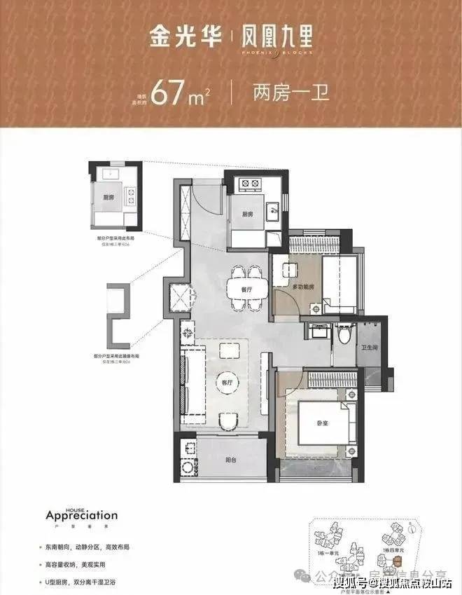 67㎡的2房2厅1卫,设计的是竖厅格局,S墙设计预留冰箱位,U型厨房,卫生间三段式分离设计,东南朝向。