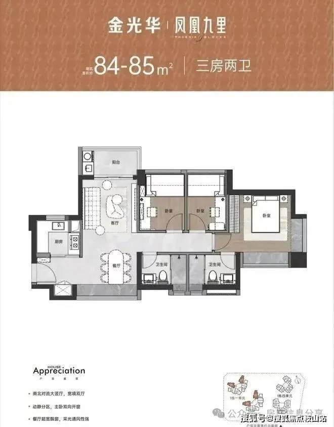 85㎡的3房2厅2卫(01.07户型),设计的是竖厅南北通透格局,主卧双飘窗设计,U型厨房,客厅阳台主朝西北、东北向。