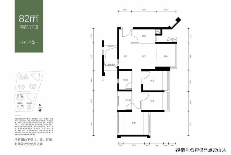 83㎡-3房2厅2卫,设计的是竖厅南北通透格局,客厅3.3米开间,3个卧室分别是3米/2.6米/2.4米的宽度,主卧南北通透设计,L型厨房,得房率:75.42%(不含赠送),01户型是西北朝向,07户型是东北朝向。