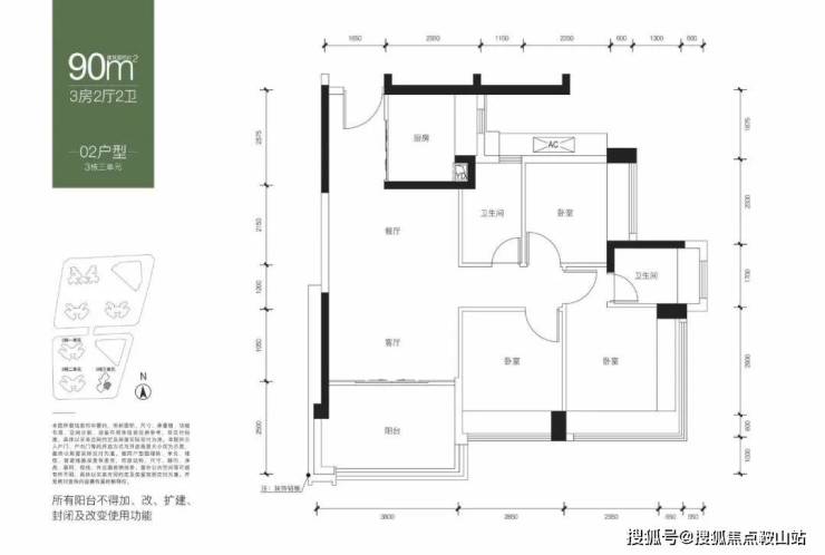 90㎡-3房2厅2卫,仅3栋2单元02户型,设计的是经典竖厅格局,客厅3.8米开间,三开间朝南,3个卧室分别是3.2米/2.95米/2.85米的宽度,L型厨房,得房率:75.97%(不含赠送),东南朝向。