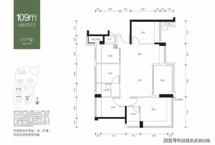 109㎡的4房2厅2卫,仅3栋3单元的01户型,设计的是横厅南北通透格局,客餐厅5.5米开间,4个卧室分别做到了3.7米/2.775米/2.55米/2.4米的宽度,L型厨房,得房率:75.98%(不含赠送),阳台主朝西北向。