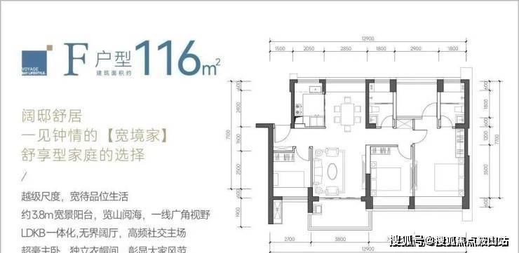 116㎡的4房2厅2卫,F户型,设计的是竖厅南北通透格局,餐客厅一体化设计,客厅3.8米开间,四开间朝南,4个卧室分别做到了主卧18.02㎡/次卧12.3㎡/次卧8.7㎡/次卧8.37㎡(包含墙体飘窗),都不用搭配飘窗做床,L型厨房,卫生间干湿分离,得房率约:88%(包含赠送),阳台主朝西南或东南向。