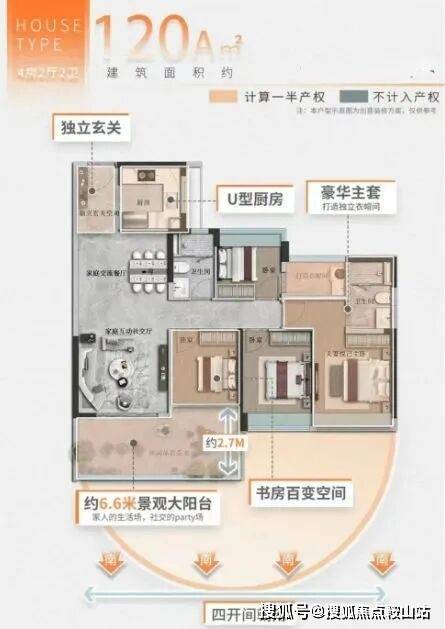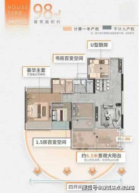 :书房改造后进深达到6米,适合家庭使用;景观大阳台延展至约6.5米。