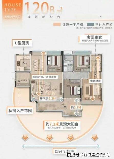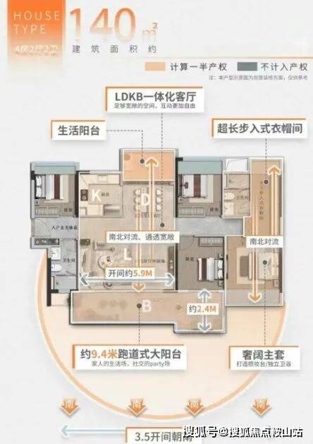 :南北对流,通透宽敞,配备约9.4米跑道式大阳台,适合家庭聚会活动。