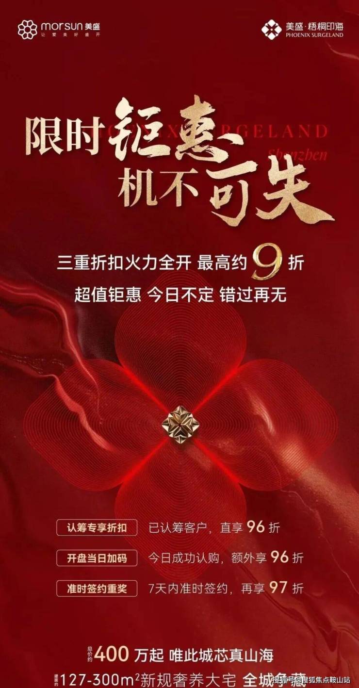 位于盐田沙头角美盛梧桐印海,于2025年12月15日取证入市,备案均价5.09万/㎡,12月27日开盘,去化率高达65%,这次开盘也是给出了8.94折的折扣优惠,折后均价4.55万/㎡,折后单价3.92-4.95万/㎡,3房总价399万起,4房总价519万起。