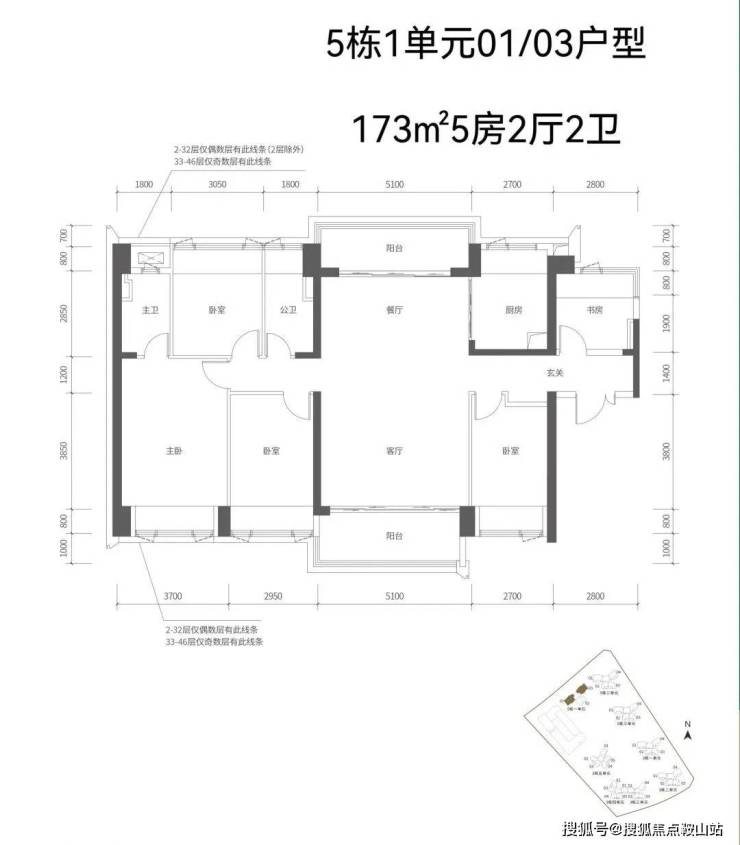 【五栋一单元-平面图】3梯3户,3条腿,分别是01、03号房户型约173㎡的5房2厅2卫、02号房户型约149㎡的5房2厅2卫