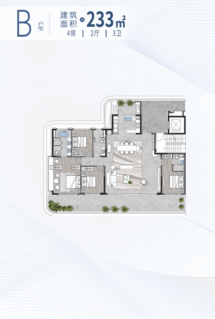 超级地中海・憘悦为了保持圈层的纯粹性,将最小户型定在 188㎡,这在常见的豪宅项目中,几乎是顶配的存在,可在这儿,也只能算是入门级。项目最大户型可达 610㎡,全盘仅有 5 套,配备天际泳池、环绕阳台,两梯一户,每一套都拥有绝佳视野,稀缺性拉满,是真正为少数人打造的顶级居所。