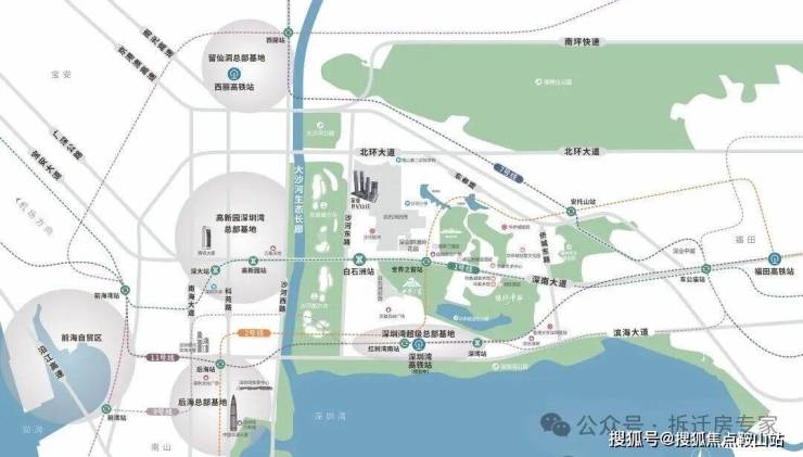 ①总部长廊·四大超级总部环绕——北有留仙洞总部基地,西有深圳湾高新区总部基地、后海总部基地,南接深圳湾超级总部基地,四大超核引擎环绕。