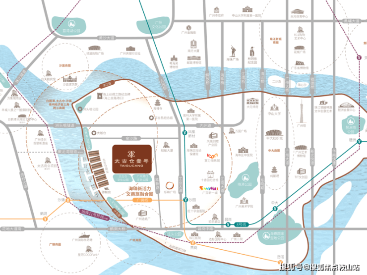 太古仓壹号坐拥传统老中轴延伸优势,串联白鹅潭商务区、聚龙湾综合体和太古仓等城市新人文地标,琶洲、白鹅潭、广钢、广纸等四大繁华商圈环绕,传统与现代兼文商旅圈,形成"水陆双循环"的顶级商圈格局。隔江对望聚龙湾太古、白鹅潭CBD,人文与艺术交相辉映,孕育全球前沿水岸生活的世界橱窗。