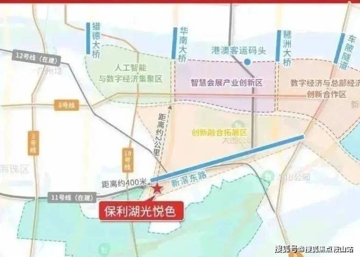 保利湖光悦色位于海珠区华洲路旁,西侧为广州海珠湿地公园,南侧邻石榴岗河,距离地铁11号线(在建)和18号线换乘的石榴岗站约600米,距离琶洲南TOD不到两公里。