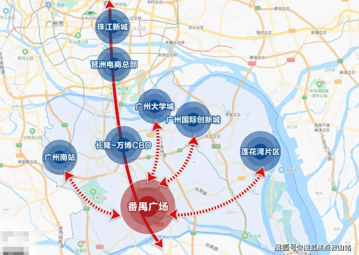 番禺广场、万博商圈 + 广州南站 + 广州国际科技创新城,三者交汇筑就番禺城央黄金三角区域。