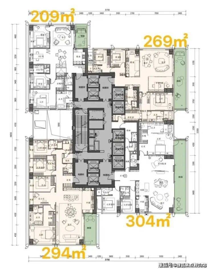 面积段约:198-209-225-245-269-294-304-375-403-500-700-1050㎡
