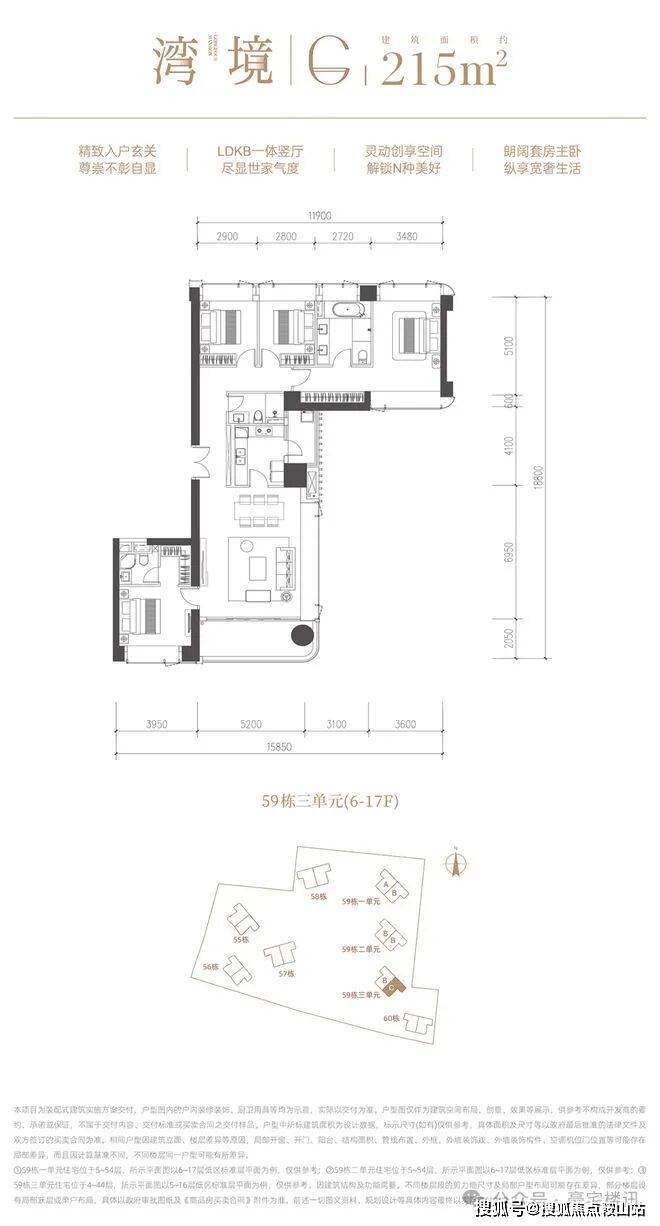 本次加推 [59栋3单元]75套房源,建面约 [ 215㎡-255㎡-295㎡ ]