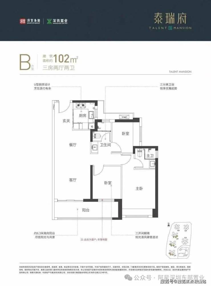 102㎡的3房2厅2卫,设计的是竖厅格局,进门入户玄关,客厅3.5米开间,三开间朝南,3个卧室分别做的3.15米/2.8米/2.65米的宽度,客厅连接次卧出6.3米长大阳台,U型厨房,卫生间三段式分离,得房率:77.48%(不含赠送),西南或东南朝向。