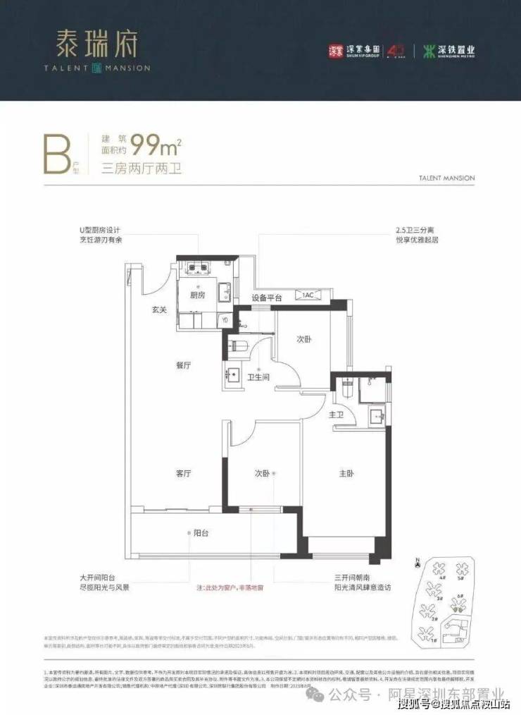 99m的3房2厅2卫,设计的竖厅格局,客厅连着卧室出大阳台,U型厨房,有东南朝向及西南朝向。