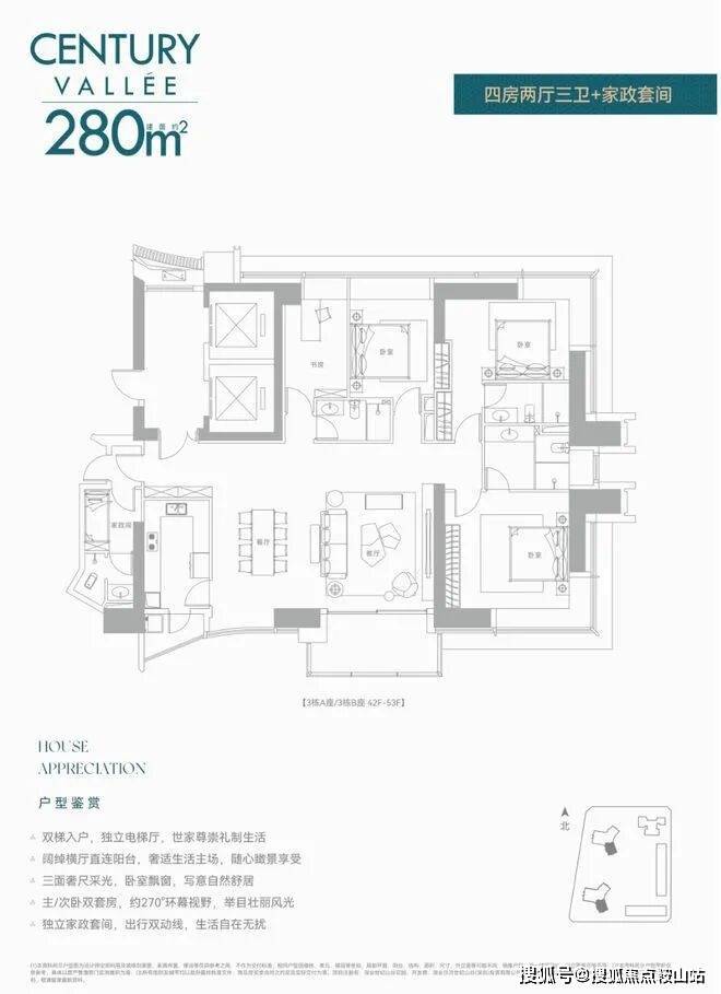 约233㎡3+1房3卫 A户型,西北朝向看名商和沙河高尔夫;