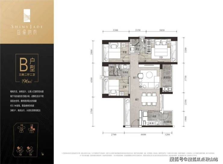 建面约96㎡三房两厅两卫:玄关处约3.7m超宽全景飘窗,兼具美观与实用性;独特的横厅设计,大气舒阔,空间实用率高;景观阳台与客厅约6m超大采光面,拥享更多阳光宠爱。