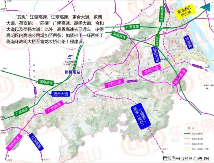 珠三角新干线(广州新)机场是全国仅有的17座4F级国际机场之一,该机场将落户高明,建设与完善“四线三站”高速客运铁路,新增3条高铁开进高明,佛山地铁2号线二期将接驳高明站。