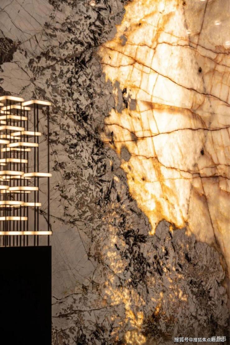 甄选全球奢石铺陈质感公区,文体中心地面采用巴西海浪石材,搭配马达加斯加蓝翡翠、意大利雪山飞狐、整幅伊朗青玉等全球珍稀奢石;