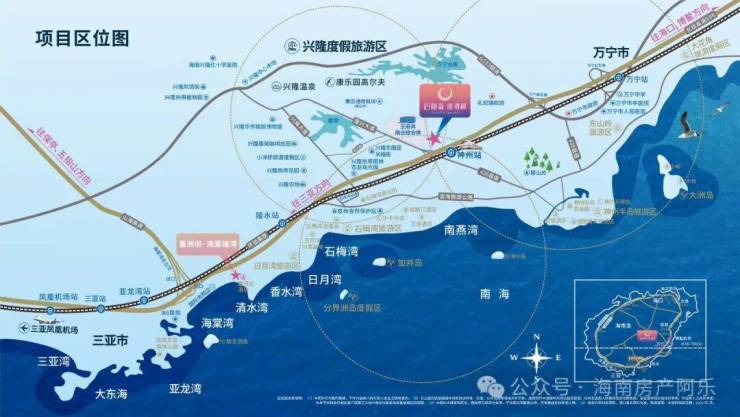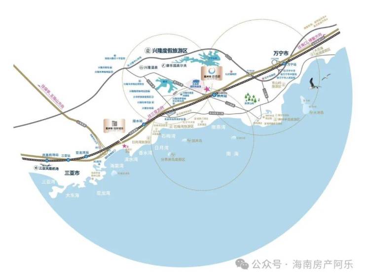 项目位于万宁兴隆温泉旅游度假区、滨海湾区、万宁市区三区交汇处,拥有着与生俱来的优势位置,紧邻交通枢纽,享环岛高速、环岛高铁、三大机场,立体交通网络畅达全岛。