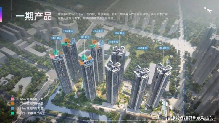 项目一共有四个户型,面积从63㎡到112㎡,都是新规产品设计,得房率不含赠送约75.9%-76.6%,加上赠送后得房率能达到88%-96%。