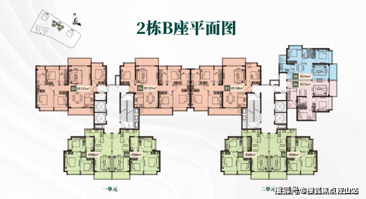 🔺2栋B座二单元04、05户型:面积约为72-74㎡的2房2厅1卫。