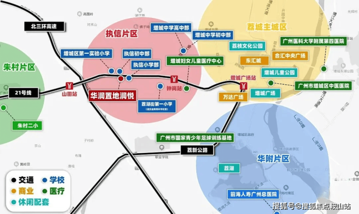 增城万达广场和东汇城两大商圈距离项目约 5km,乘坐地铁仅一个站即可到达。项目对面有 4 万方的大型商业体正在建设中,山田地铁站附近约 20 万平的荔富汇景商业综合体也已动工,未来商业氛围将愈发浓厚 。