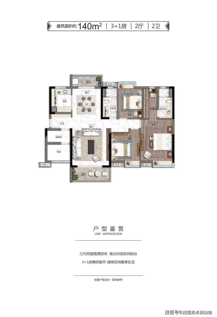 140㎡的 3 + 1 房 2 厅 2 卫户型,适合三代同堂居住,精研细节,空间阔绰 。