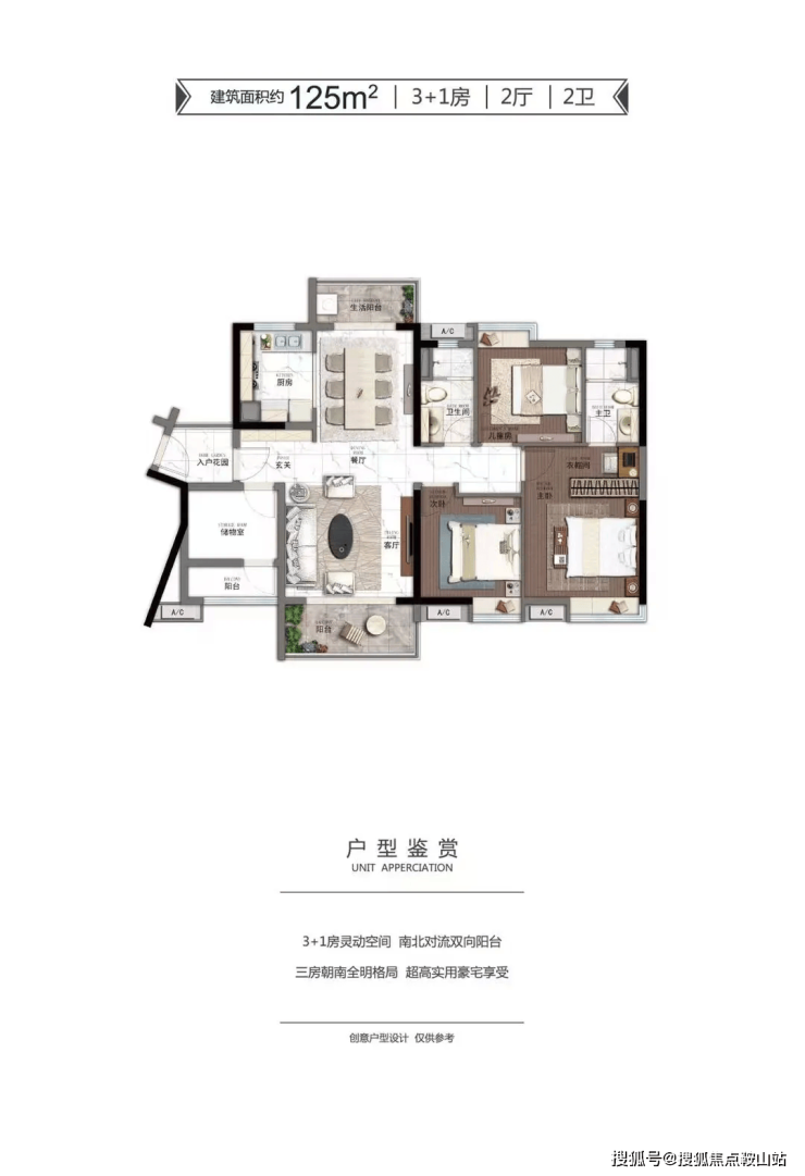 125㎡的 3 + 1 房 2 厅 2 卫户型,南北对流,双向阳台,三房朝南全明格局,空间灵动;