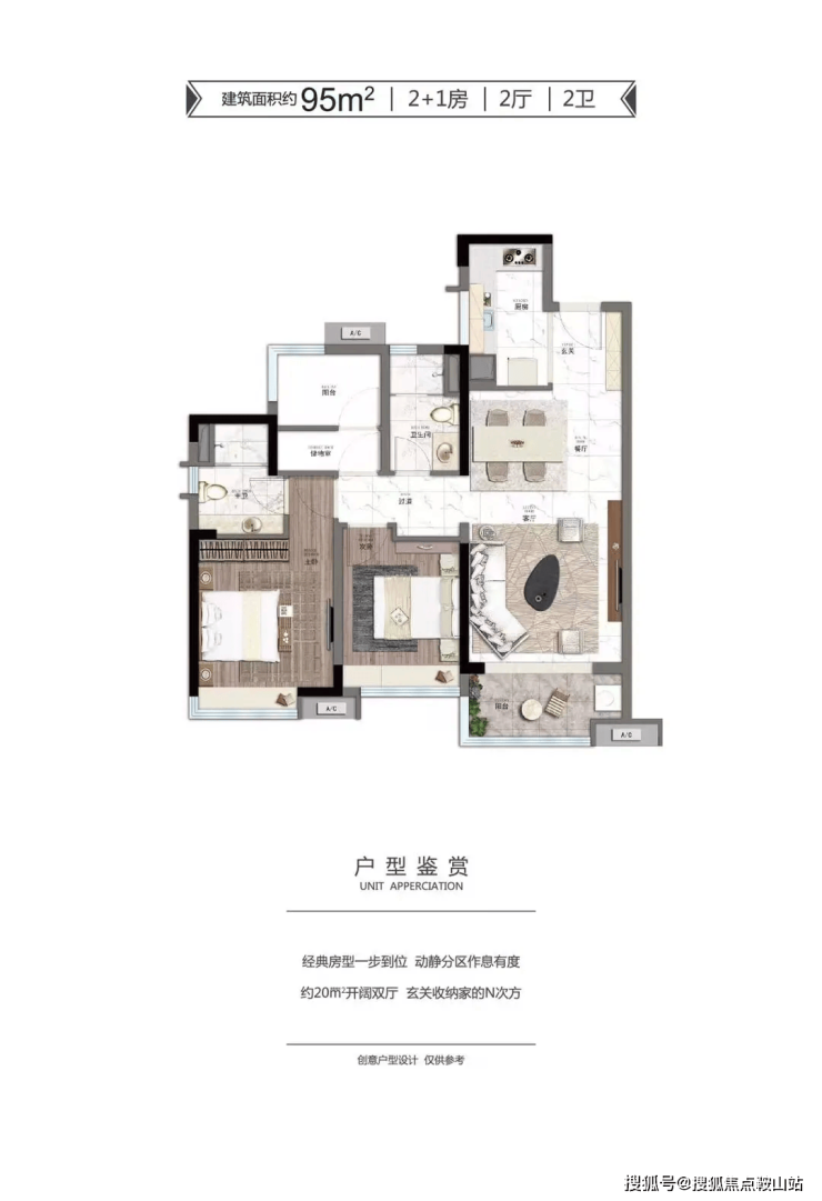 95㎡的 2 + 1 房 2 厅 2 卫户型,经典实用,动静分区合理,约 20㎡的开阔双厅和玄关收纳设计,增加了生活的便利性和空间利用率;