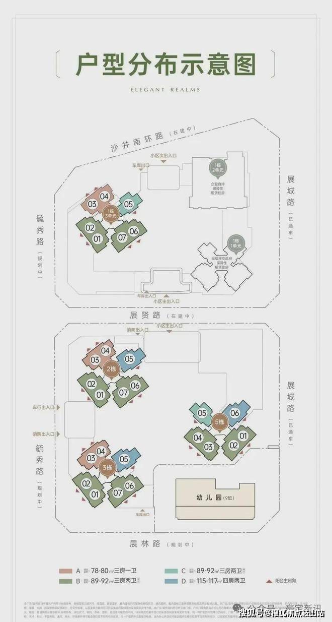 其中2栋住宅,31F,3T7户;3栋住宅,32F,3T7户;5栋住宅,32F,3T6户; 4栋为1所4层2970㎡幼儿园。