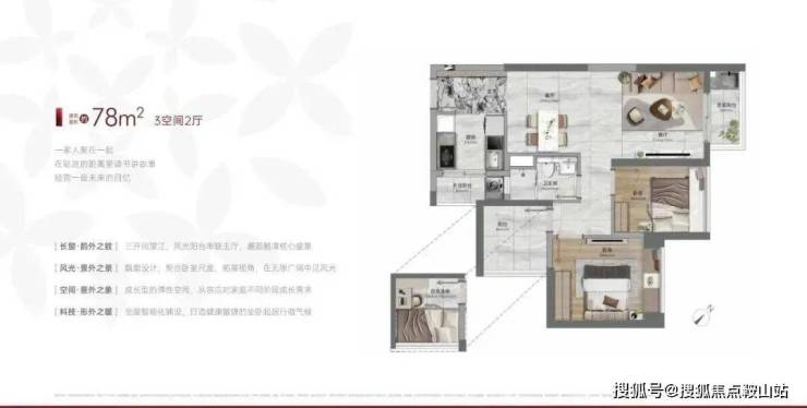 建面76-78平三房一卫,三开间望江,私密入户玄关,带生活阳台,主卧次卧都可望江,总价280万起!