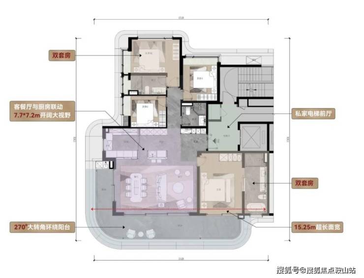 约10.8米南向超级横厅,连接进深达 2.4米的环幕阳台,形成IMAX级全景瞰海视野,让海景与光景毫无保留地充盈室内。双主卧套房设计,完美兼顾家族共居的私密性。创新设计的隐藏式800库(仅适用273户型),为环球旅藏、兴趣装备提供专属空间,将生活的热爱与仪式感藏于秩序之下。