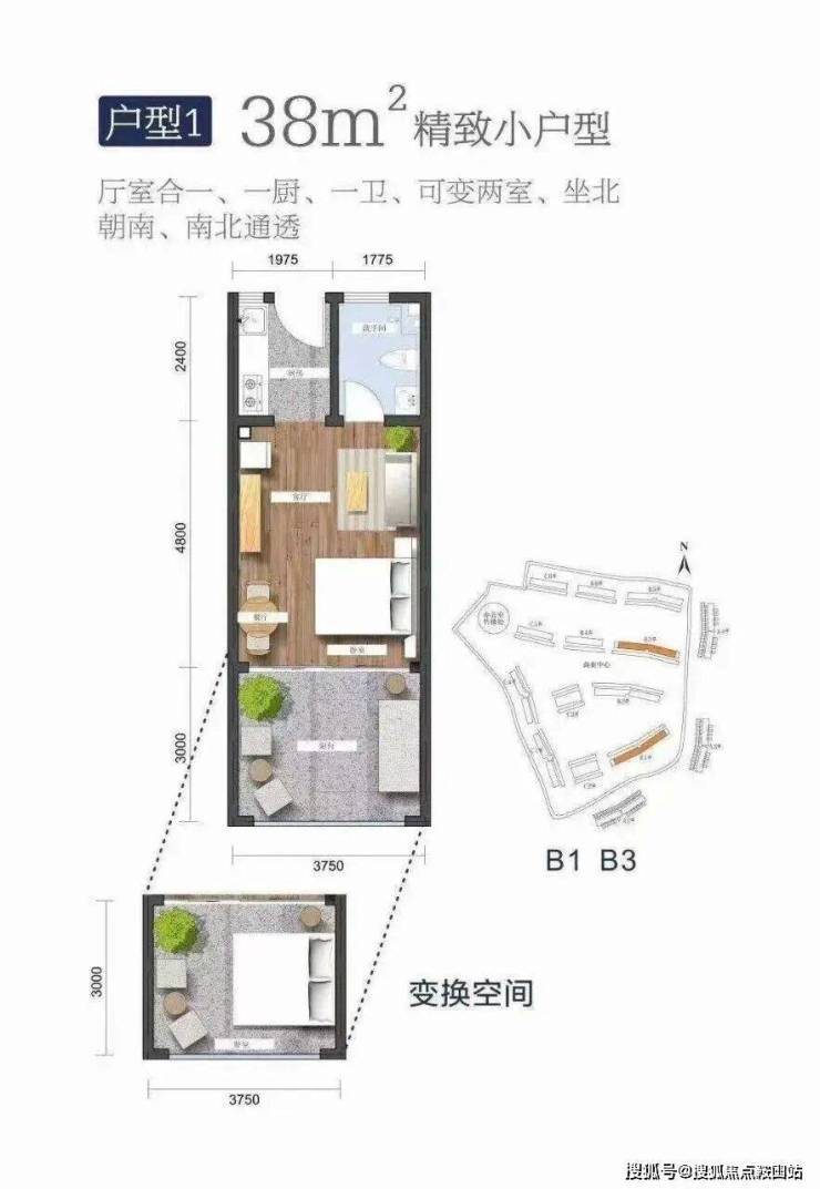 建筑面积38㎡,一室一卫,可变换两室,坐北朝南,南北通透,硬装交付