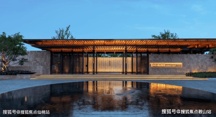 从环岛落客区开始,墨色水景、非对称挑檐、莱姆石以及漭水纹样、玻璃照壁…