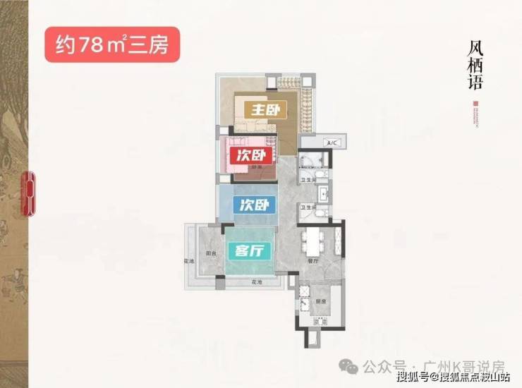 抢手的约90㎡横厅三房,客餐厅(含飘窗)开间约6米,主卧带270度飘窗。