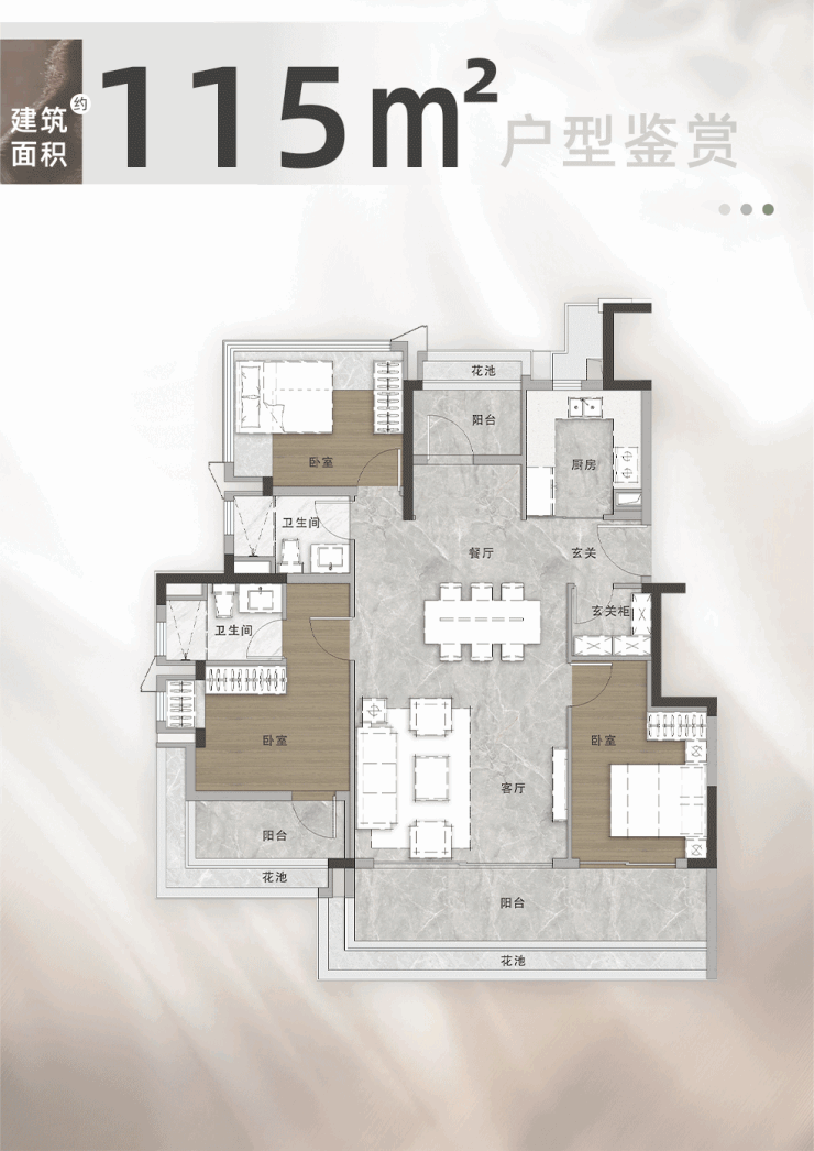 也有约110㎡的明星四房,客厅一面带飘窗,采光更佳,视野更开阔。