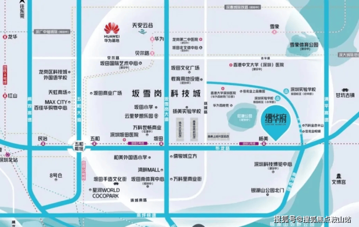 交通枢纽:项目周边交通网络发达,距5号线杨美地铁口约500米,2站到五和站换乘10号线;坂银通道(已通车)距离项目约2公里,快速通达罗湖、福田中心区。