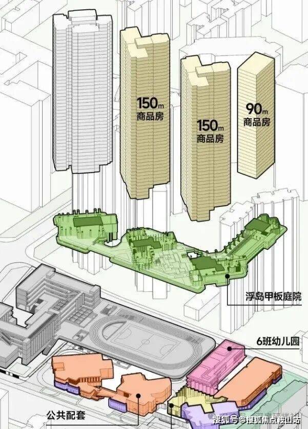 说直接点,就是将四栋建筑安置在这个甲板上,形成一个超级社区底盘+ 浮岛绿化甲板的模式。