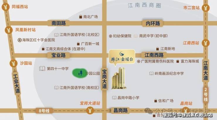 2/8号线双地铁上盖:约280米即达8号线宝岗大道站,20分钟直通达珠江新城;约800米2号线江南西地铁站,可通达广州南站等大型交通枢纽;