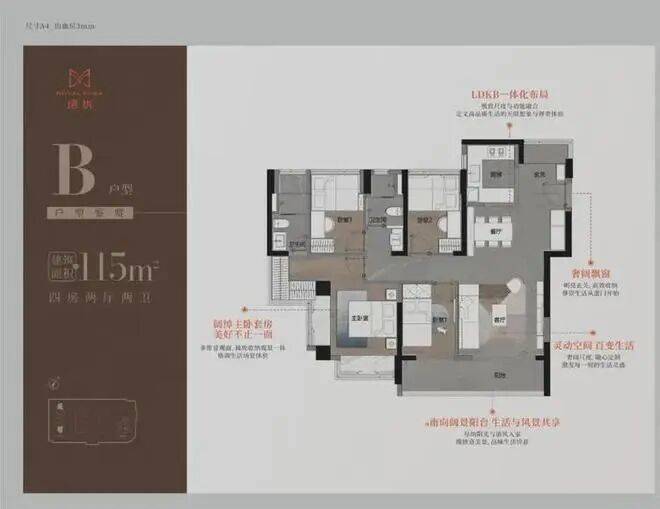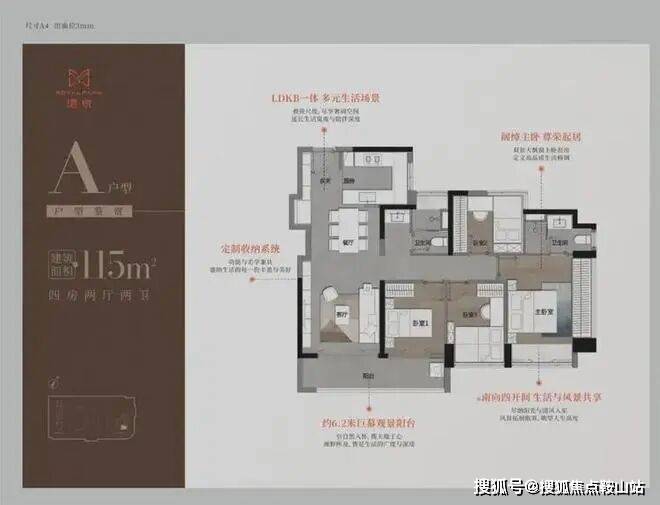 115㎡四房二卫A/B户型,大阳台,主卧通过凸窗赠送衣柜,但次卧尺度都偏小。