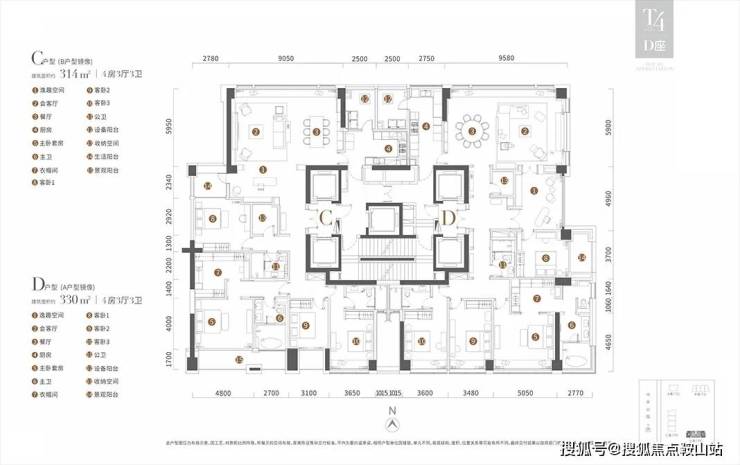 户型:建面约313-540㎡,涵盖313-330㎡的4房2厅5卫大平层,以及530-540㎡的顶层复式