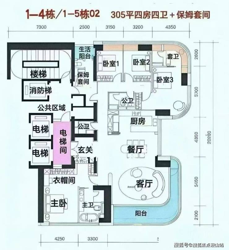 E栋302㎡户型为3梯2户,打造4房4卫+家政套间,客餐厅约8米进深、7米开间;B栋370㎡户型为5梯2户,打造4房5卫+家政套间,客餐厅约9.2米进深、7米开间。项目采用框架结构,户内墙体可自由改动,空间灵活可变。