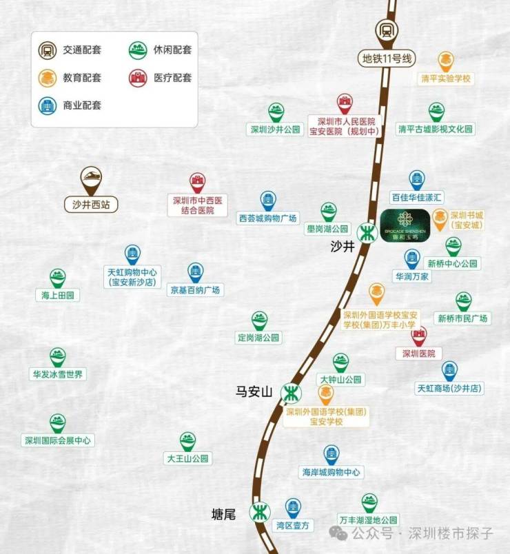 项目距离地铁11号线沙井站步行仅约460米,北侧为百佳华佳漾汇,可满足居住购物与娱乐需求,且2公里范围内有天虹商场、万丰海岸城购物中心,商业氛围较为浓厚。