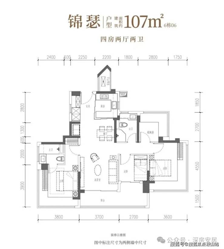 107㎡的4房2厅2卫,设计的是竖厅双龙抱珠格局,客厅3.7米开间,LDKB一体化设计,预留冰箱卡槽位,四开间朝南,主卧+2个次卧270°无柱转角飘窗,卫生间干湿分离,得房率约104.06%(包含赠送),客厅连接次卧出超大阳台约11.76平,东北朝向。