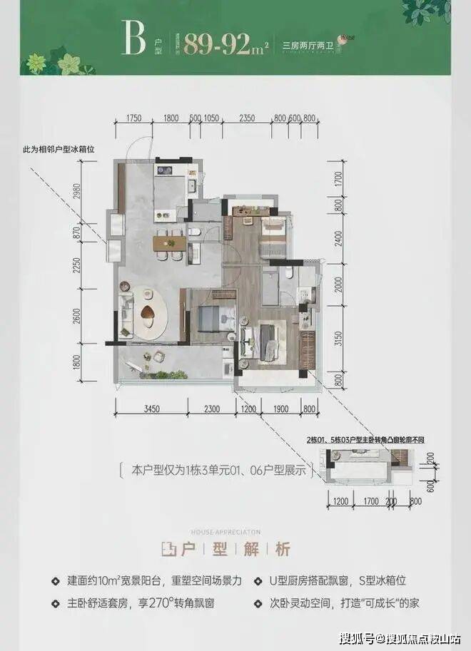 前海会展首发建面约78-117㎡三四房新规作品,户型拓展后实际使用率最高可达105%;主、次卧270°转角双飘窗(建面约117m次卧除外);建面约9-13㎡新规宽景阳台重构居住想象