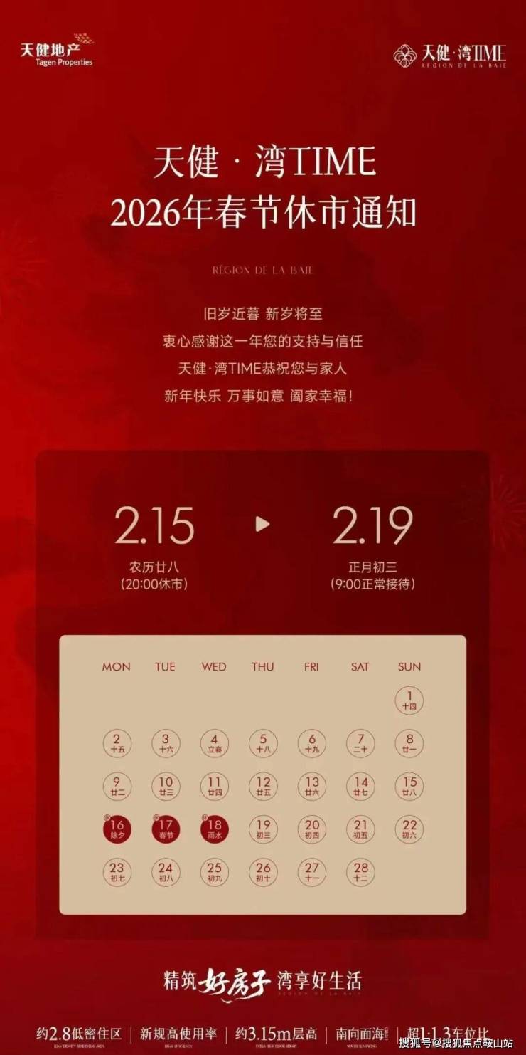 尊敬的购房者:天健·湾TIME自 2026 年2月14日起,启用统一官方认证热线,售楼处、营销中心、开发商直连、预约看房等服务一站直达,无中介介入,全程保障购房者权益,具体信息如下: