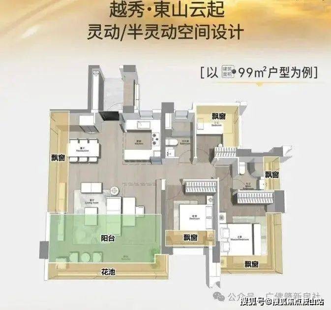 越秀·東山云起作为越秀区首个“新规”项目,阳台占比达20%,使用率超100%-120%,全南向设计,灵活可变布局,配备无柱阳台、入户花园等,空间利用率极高,适配中产家庭及改善型需求。创新采用垂直分区设计,基于社区生活会所化理念,打造了一个超级底盘,主推98-139㎡四房,至于价格方面: