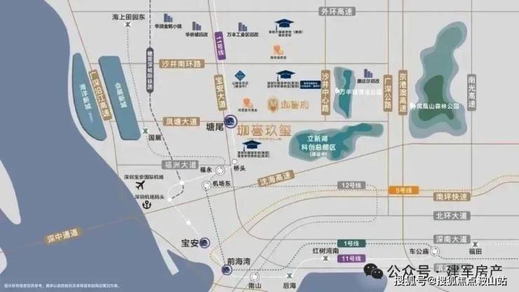 项目位于沙井新桥,珈誉府本身是一个大型综合体,自身配套丰富,自带50万㎡大型商业;地铁11号线塘尾站挨着项目,深圳外国语宝安学校在项目南北两侧,且靠近万丰湖、立新湖,有生态资源。