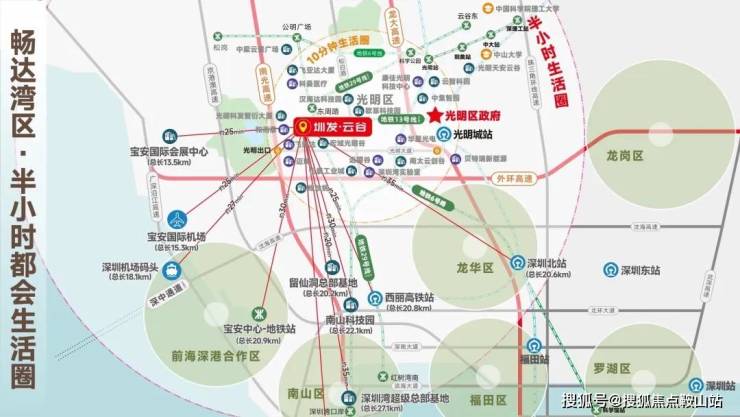 项目雄踞光明科学城西部门户,地处南光高速光明出入口(直线距离约500米),毗邻光明国际汽车城,周边交通路网发达,无缝互通广深莞惠;30min无阻通达宝安中心区、南山、松山湖,极速接驳深圳湾总部基地、南山科技园、前海中心区等城市重点片区